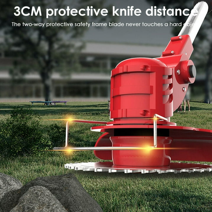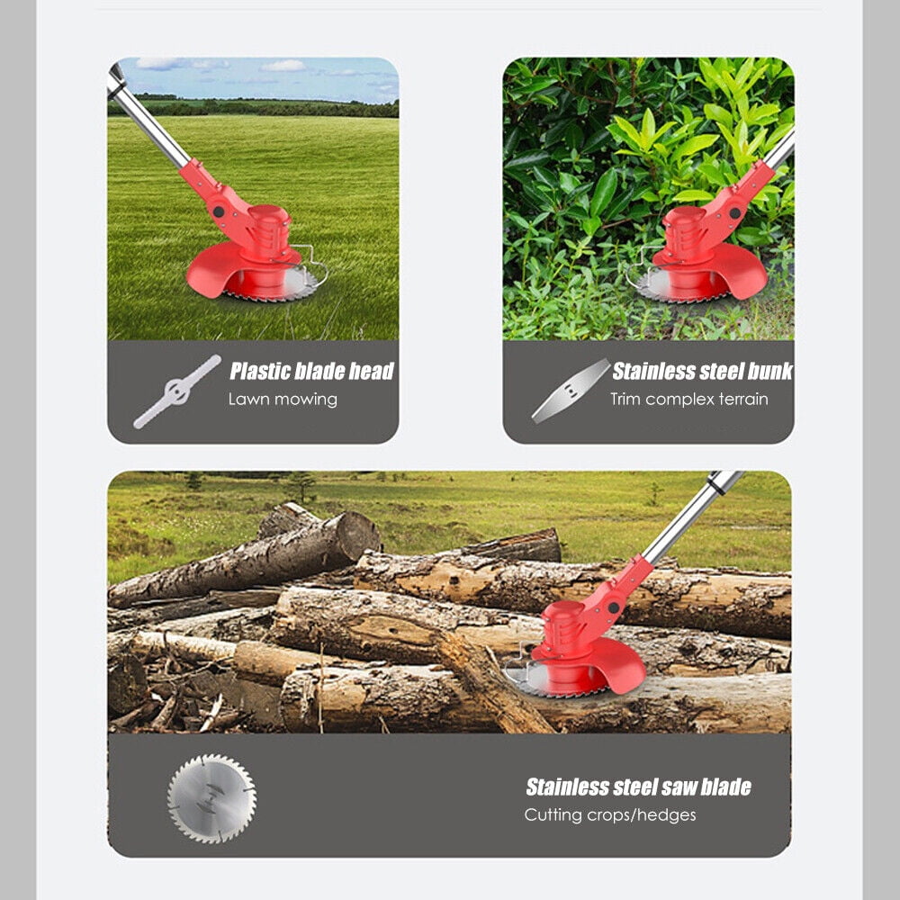 【3-IN-1 3 kinds of blades for lawn mower】There are 3 different types of blades for electric cordless lawn mower. Multi-purpose: plastic blade is suitable for cutting grass on soft lawn; Stainless steel metal blade is suitable for pruning weeds and small shrubs; 40-tooth alloy saw blade is very suitable for cutting thick shrubs, branches and seedlings. To avoid damaging the blade, please choose the correct blade when weeding. )