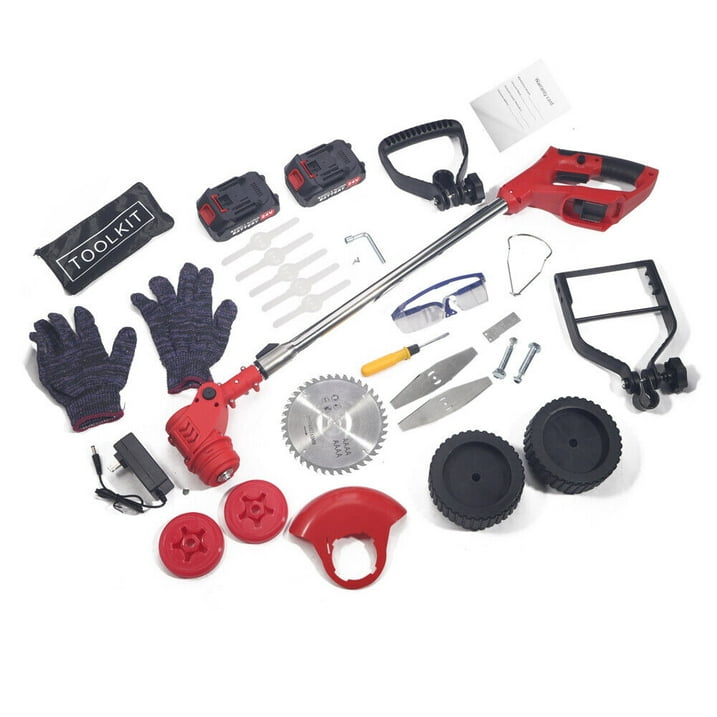 【Premium Weed Wacker& Professional Service】 Package includes 1 electric brush knife, 2 stainless steel blades, 1 alloy saw blade, 3 plastic blades, 2 batteries, 1 upgraded wheel, 1 goggles, 1 small rotary wrench, 1 weeding charger, 1 pair of gloves and 1 manual. Our service starts when you place an order, and 24-hour friendly customer service keeps you away from after-sales troubles.